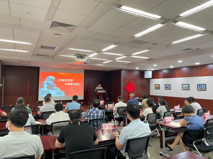 會上集團紀委書記劉東華以《上好廉潔黨課,永葆廉潔初心》為題,從“廉潔的內涵和歷史沿革”“守紀律,強作風”等方面,結合國企具體工作情況,為大家上了一堂生動形象、內容豐富、切合實際的廉潔黨課,隨后,大家集中學習觀看警示教育片《零容忍:不負十四億》。