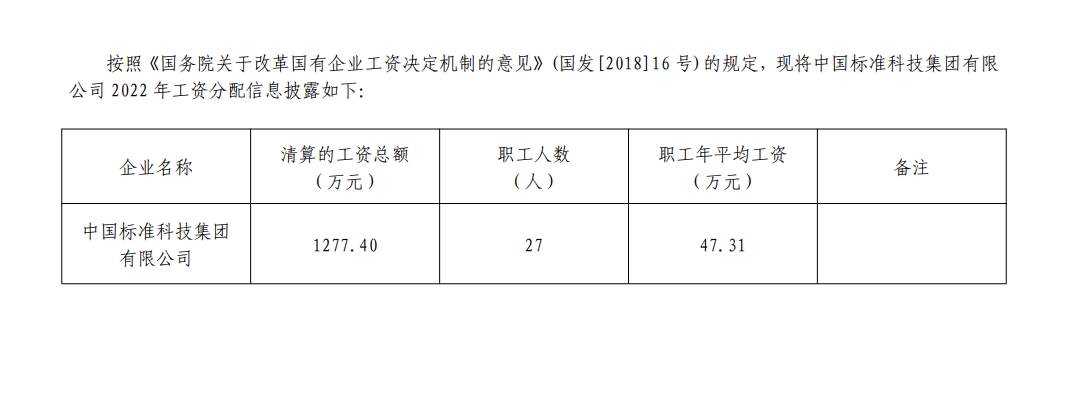 2022年中國標準科技集團有限公司工資分配信息披露
