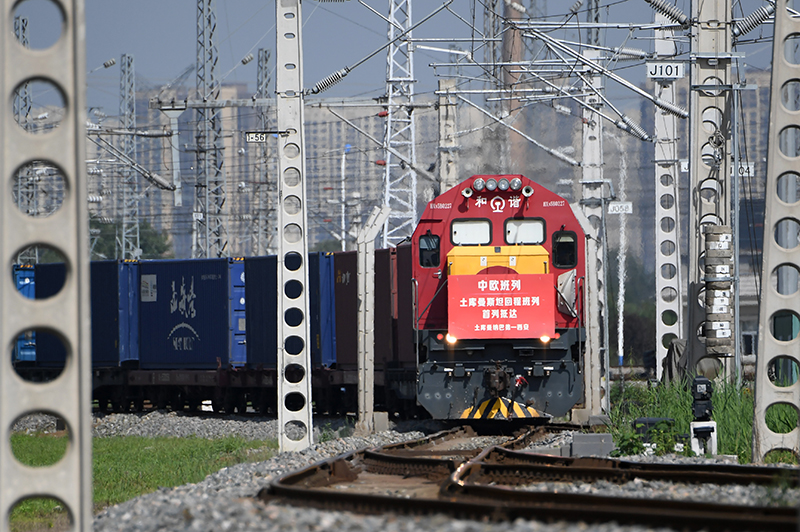 滿載土庫曼斯坦甘草中藥材原料的中歐班列回程列車抵達西安國際港站(2022年8月31日攝)。新華社記者 李一博 攝