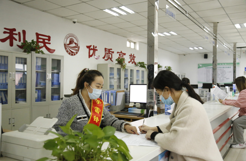 河北省邢臺市襄都區宴家屯鎮綜合服務中心工作人員協助辦事群眾填寫相關表格(2022年3月30日攝)。新華社發(張馳 攝)