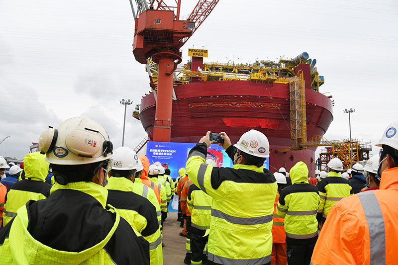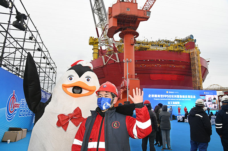 11月29日,一名工人在企鵝圓筒型浮式生產(chǎn)儲(chǔ)卸油裝置(FPSO)交付儀式上與吉祥物合影。