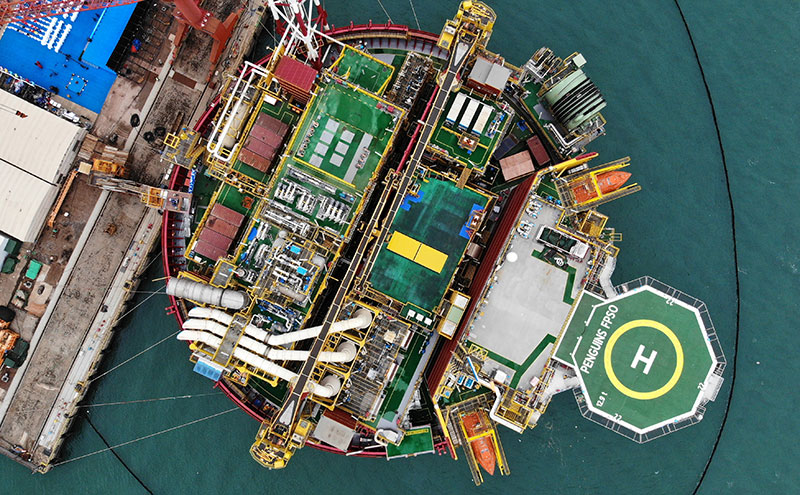 這是11月29日在山東青島拍攝的企鵝圓筒型浮式生產(chǎn)儲(chǔ)卸油裝置(FPSO)(無(wú)人機(jī)照片)。
