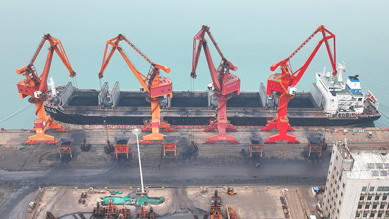 11月28日,在江蘇連云港港煤炭碼頭,貨輪在卸載到港的電煤(無人機照片)。