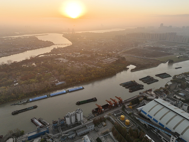 11月28日,運輸電煤的船舶經過京杭大運河揚州段(無人機照片)。