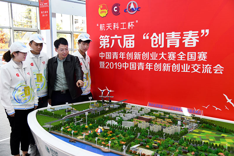 2019年11月1日,在山東青島舉行的第六屆“創青春”中國青年創新創業大賽全國賽暨2019中國青年創新創業交流會上,參會人員在給志愿者介紹新鄉村智慧能源服務模式。新華社記者 李紫恒 攝
