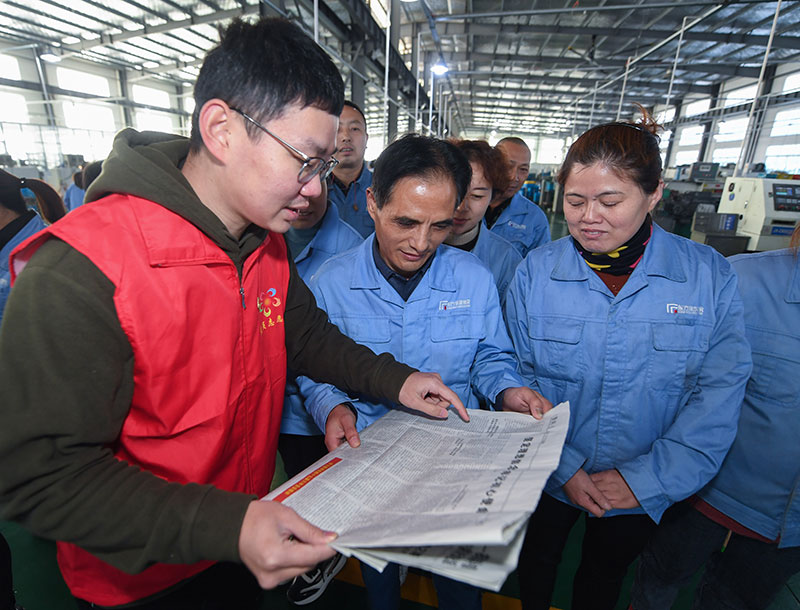2021年11月24日,在浙江省杭州市臨安區一家公司車間,青年黨員志愿者在宣講黨的十九屆六中全會精神。新華社記者 徐昱 攝